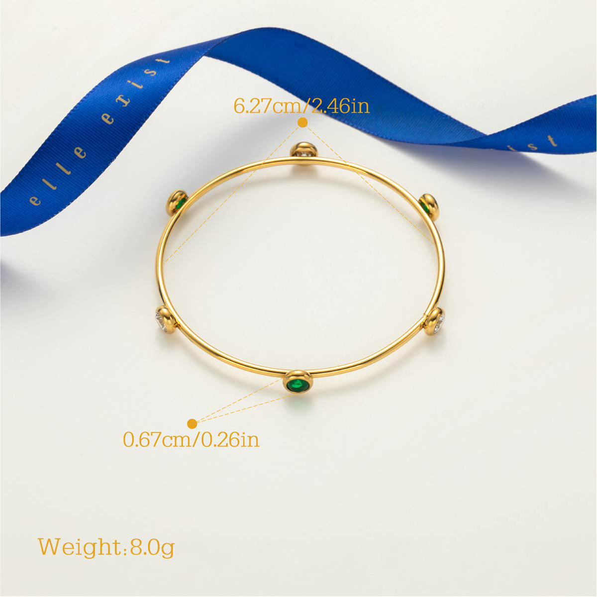 A delicate harmony of sleek lines and radiant accents, this bangle is adorned with luminous spheres in shades of white, green, and crystal-clear brilliance. Its minimalist silhouette meets vibrant detailing, creating a piece that feels both timeless and contemporary. Designed for effortless layering or a statement on its own, it reflects elegance in motion.