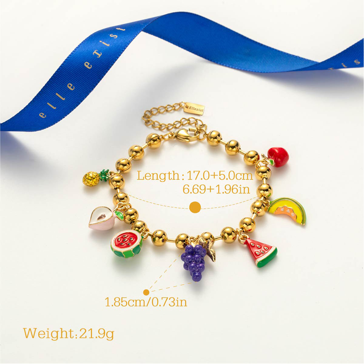 A joyful celebration of color and whimsy, this bracelet is adorned with vibrant fruit motifs that capture the spirit of endless summer. From juicy watermelon to sweet grapes and tropical delights, each charm adds a playful touch, making it the perfect accessory for those who love to carry sunshine and fun wherever they go.