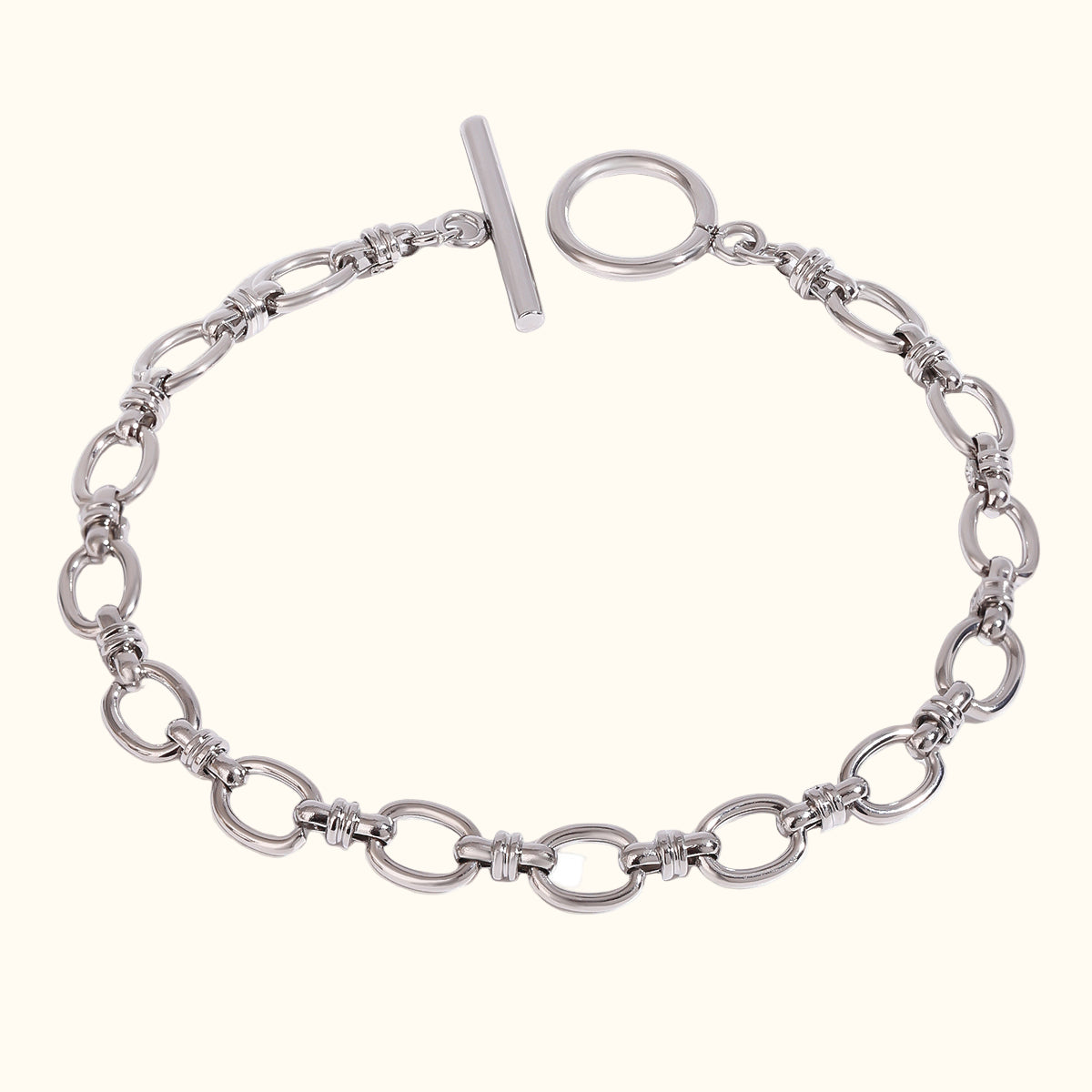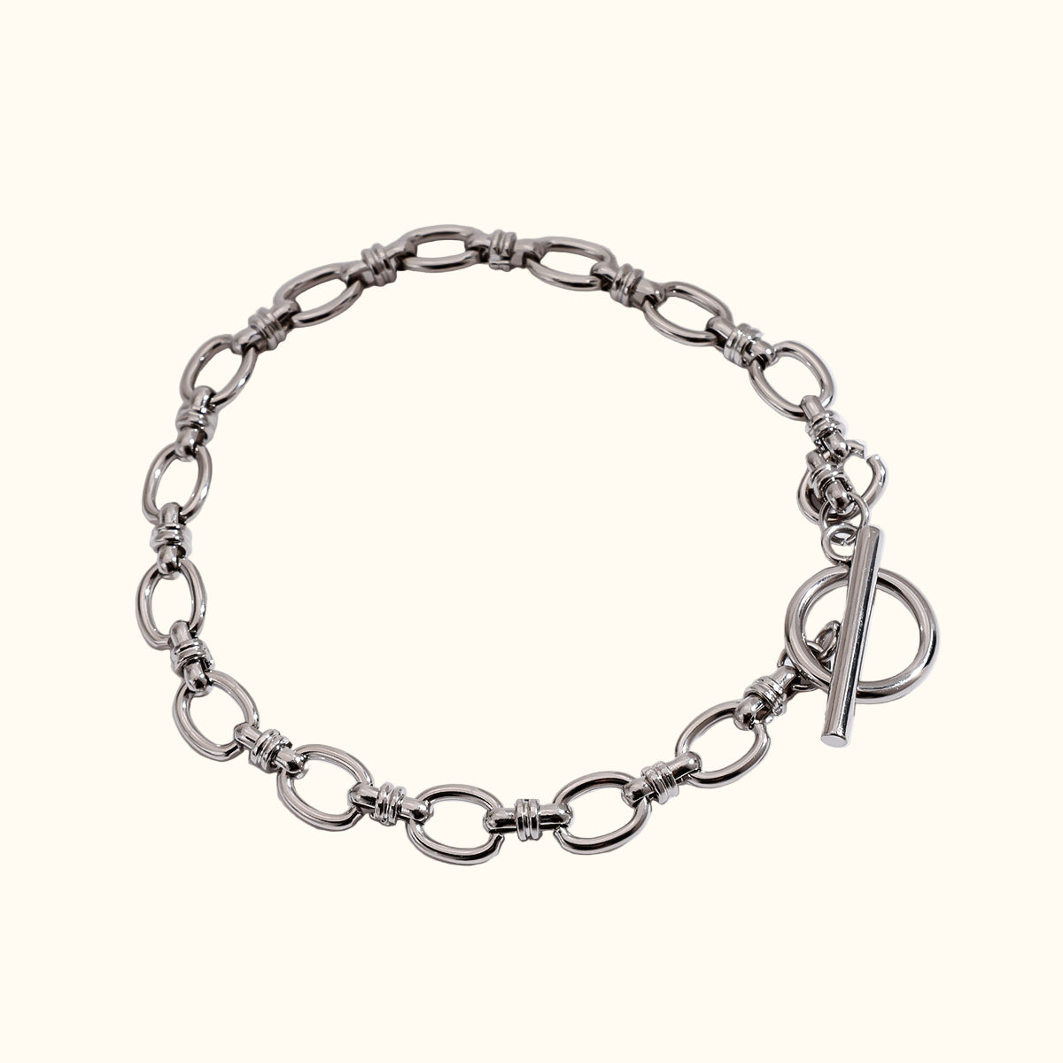 The Eternal Links Bracelet is a sophisticated accessory that embodies elegance and timeless style. The toggle clasp adds both functionality and a touch of modern flair, ensuring a secure fit while enhancing the overall aesthetic. Perfect for layering or wearing solo, this bracelet is versatile enough to complement both casual and formal outfits. Embrace the beauty of connection and continuity with the Eternal Links Bracelet, a must-have addition to your jewelry collection.