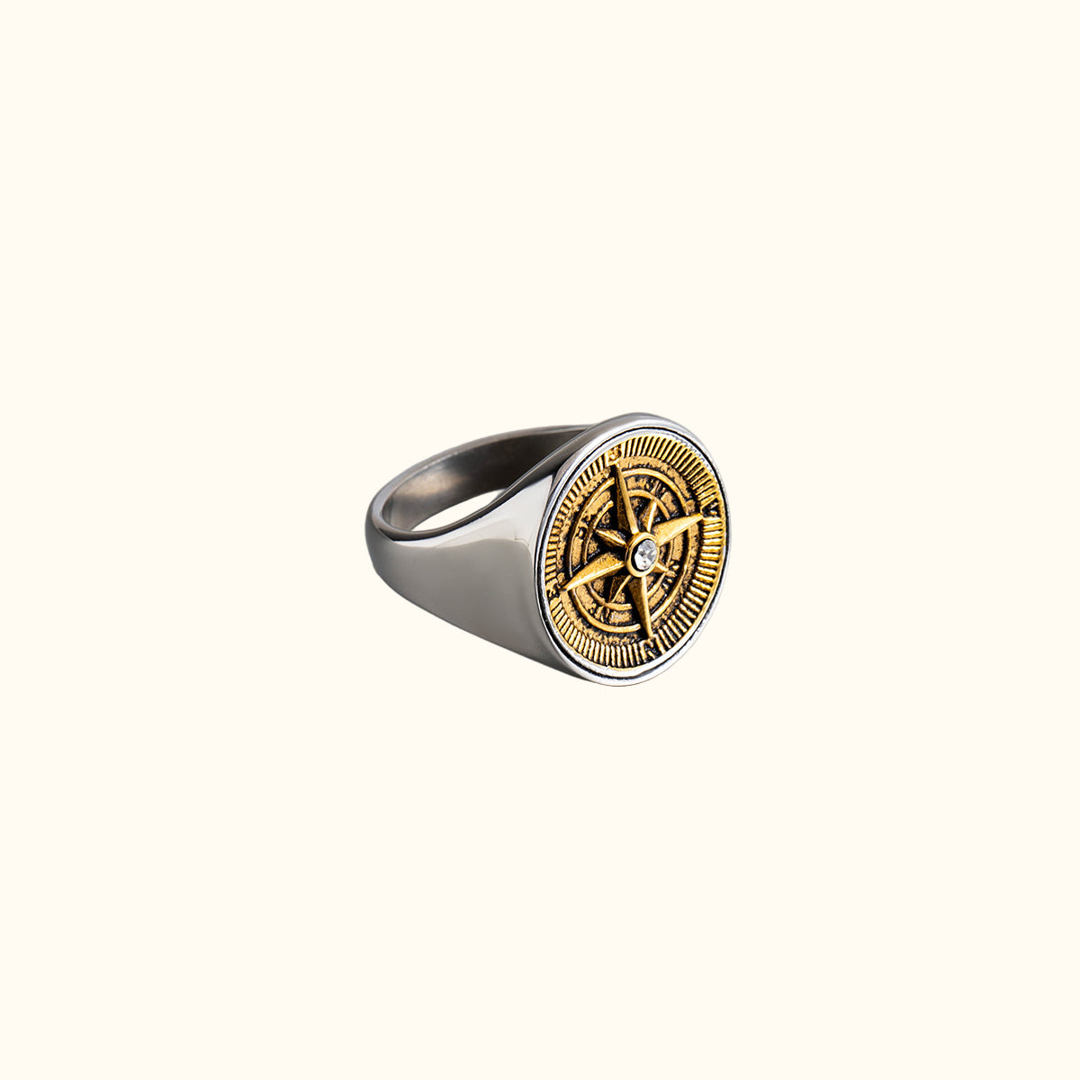 The Navigator's Compass Ring features a bold and intricate compass design, symbolizing guidance and adventure. The striking contrast between the gold-toned detailing and the polished band creates a sense of exploration and discovery. At its center, a sparkling stone adds a touch of brilliance, enhancing the overall allure of the piece. Ideal for those who embrace life's journey, this ring serves as a reminder to follow one's path with confidence and style.