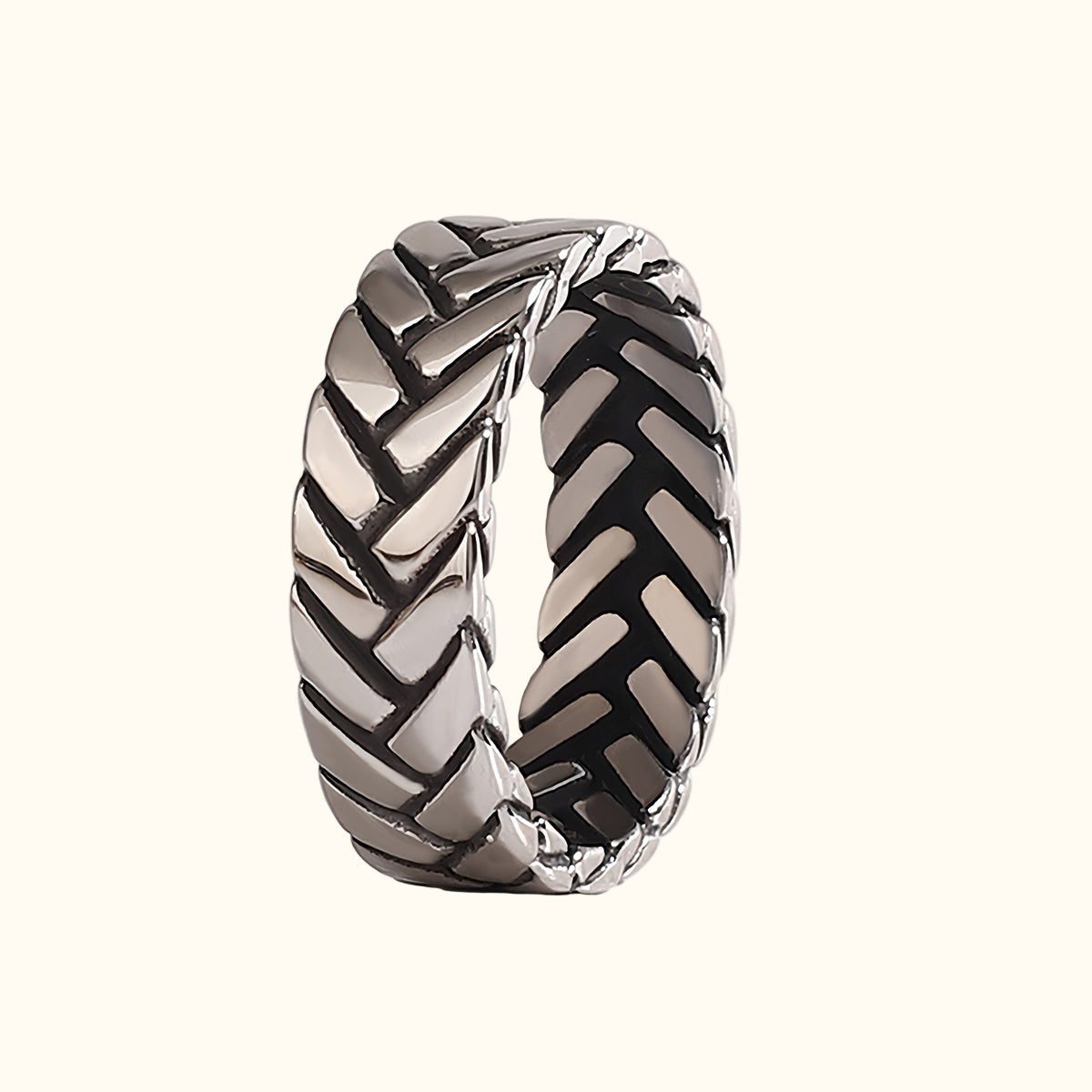 The Bold Weave Band is a striking statement piece that combines intricate design with a robust aesthetic. Crafted in a unique herringbone pattern, this ring features a blend of polished and matte finishes that create depth and texture. Its substantial width and bold silhouette make it perfect for those who want to express their individuality and confidence. Whether worn as a standalone piece or stacked with other rings.