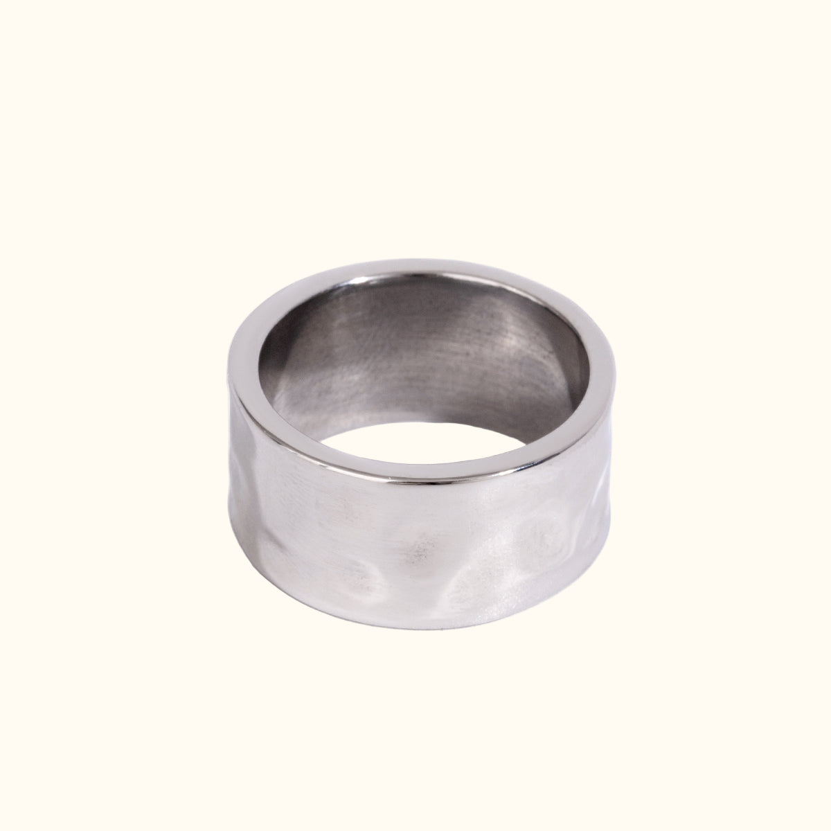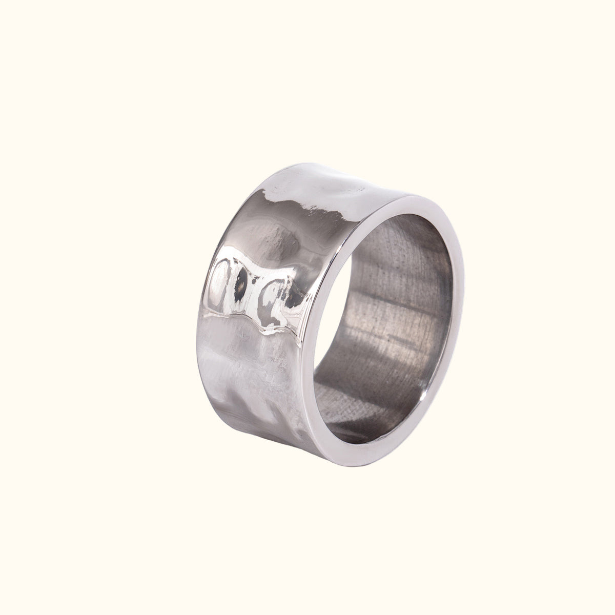 The Bold Elegance Ring features a striking, reflective finish that captures light beautifully, creating a dynamic visual effect. Its substantial width and smooth, contoured design provide a modern yet timeless appeal. This statement piece embodies strength and sophistication, making it an ideal addition for the discerning man who values distinctive style and craftsmanship.