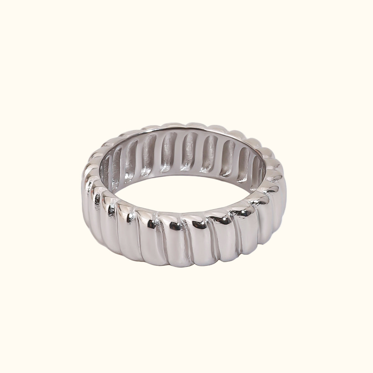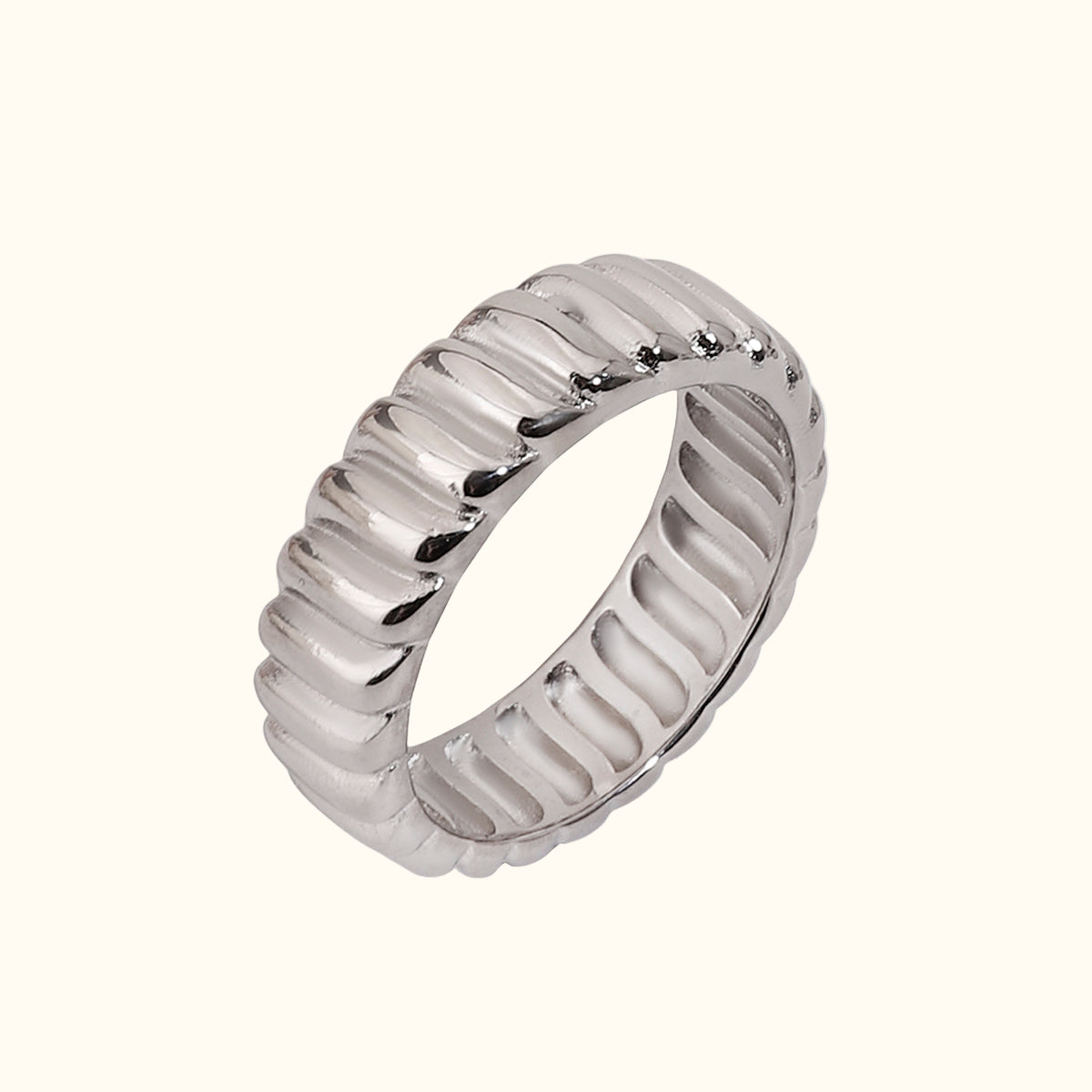 The Ripple Radiance features a sculptural design with elegant ridges that catch the light beautifully. Its unique texture adds visual interest, making it a standout piece. Perfect for everyday wear or special occasions, this band embodies contemporary style and timeless elegance.